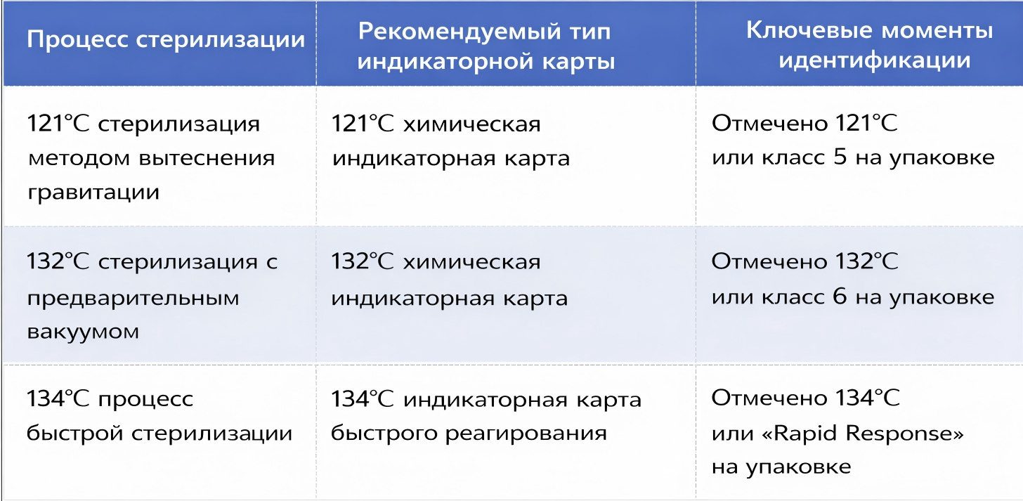 Разные процессы стерилизации имеют различные сочетания параметров температуры, времени и давления, и химические индикаторные карты разрабатываются с учётом конкретных порогов температуры и времени. Каждая карта строго соответствует определённому набору параметров стерилизации — только когда температура и время процесса стерилизации точно соответствуют «критериям срабатывания» карты, она достоверно указывает на достижение стерильности через изменение цвета (например, с жёлтого на чёрный).